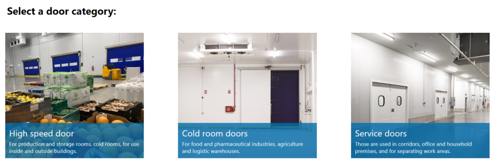 Many Doors to Choose From: We have over 1,000 industrial doors for cold storage, food factories, logistic centers, and more.